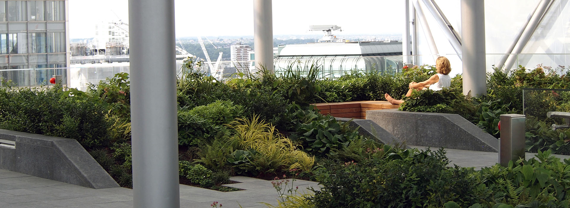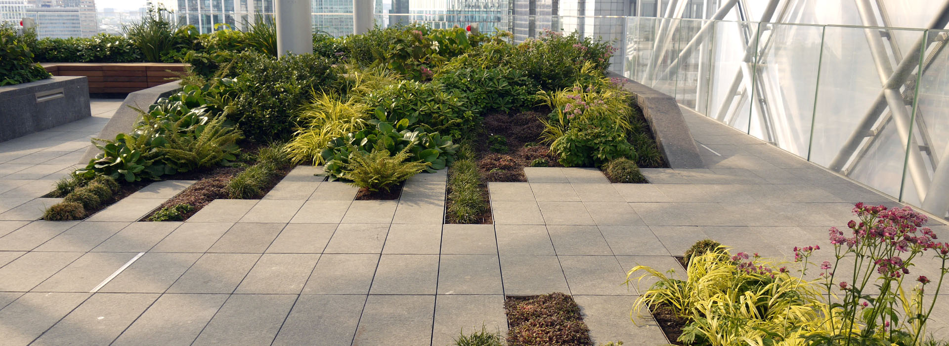 The terraces provide useable, relaxing green spaces for the office workers and contrast with the surrounding hard urban environment. The planting character is subtly different on each level with a common theme. The plant palette was particularly challenging on the top terrace by the propitious microclimate formed beneath an ETFE roof shelter. The extensive roof area outside this terrace incorporates Sedum species and wildflower mixes as well as insect habitats and bird boxes, all of which aim to enhance biodiversity in the City.