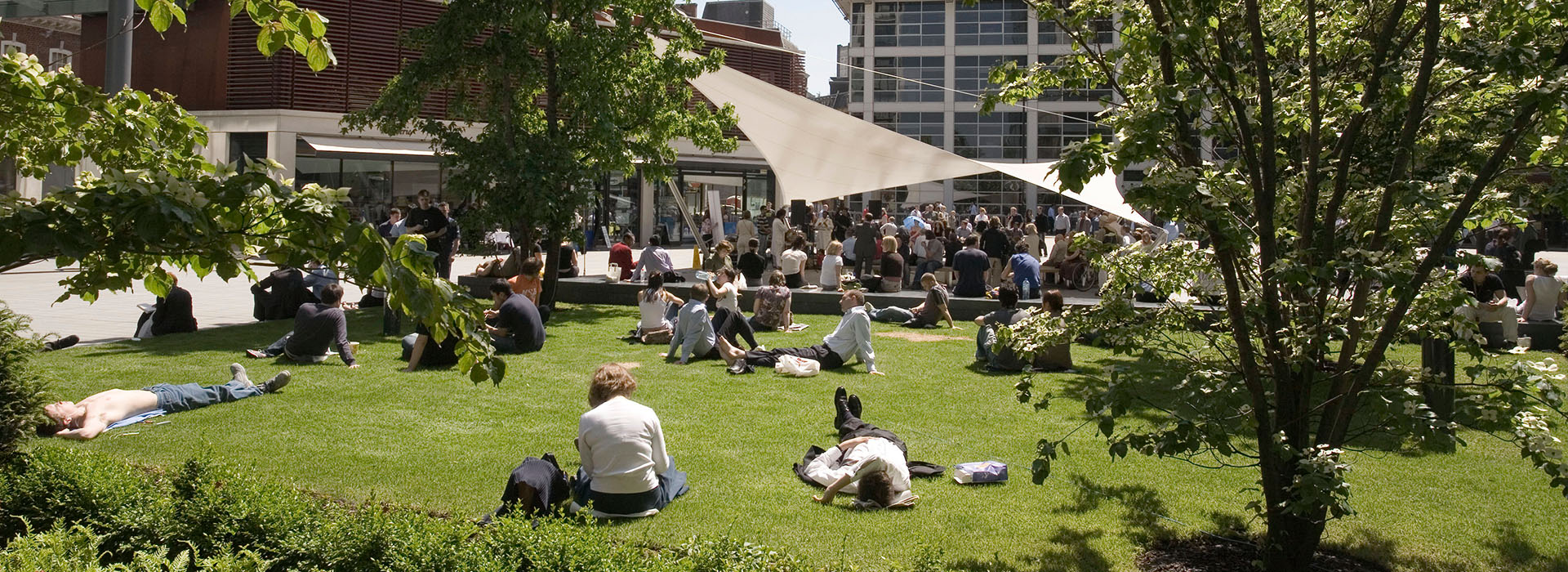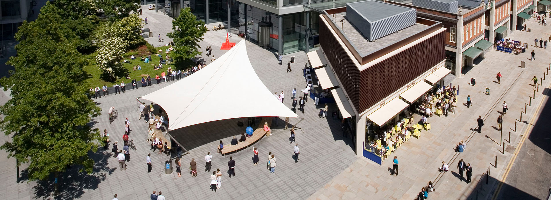 Carefully sited areas of verdant planting with semi-mature trees, herbaceous planting and wildlife area are integrated with communal seating and a large reflective water lily pool, which together with granite bench seating provide a place for contemplation and relaxation in the heart of the city.