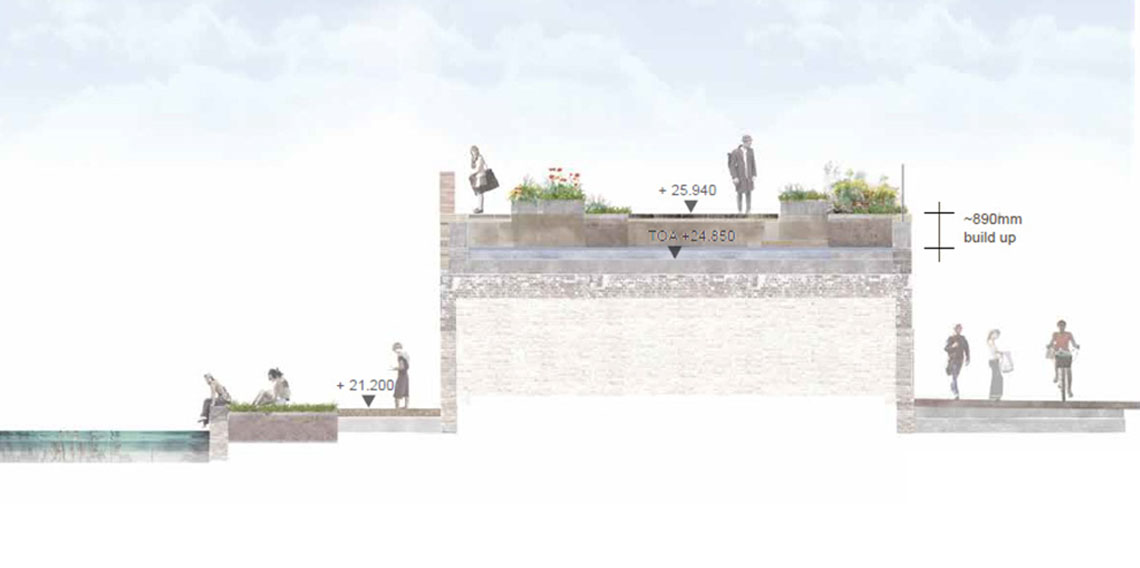 The Canal Corridor aims to celebrate the architectural heritage whilst improving access and re-establishing its importance as a route and a focus for biodiversity. The corridor has the most open aspect of anywhere at King's Cross and its south facing location means that the corridor receives sun throughout the day.