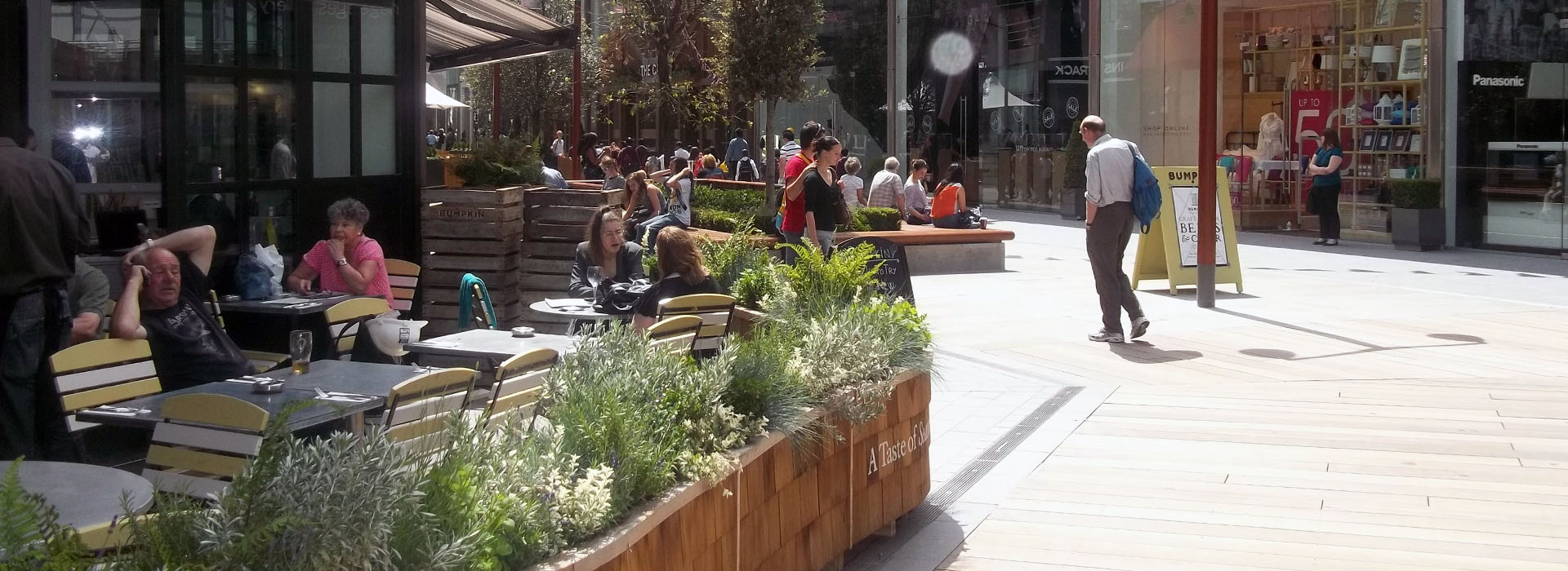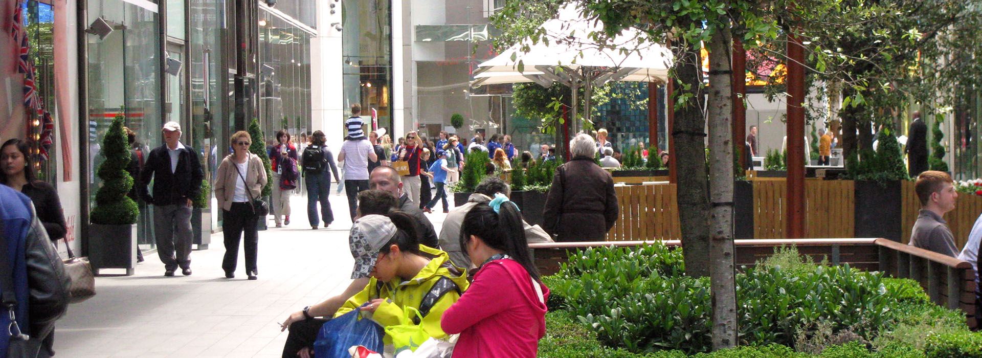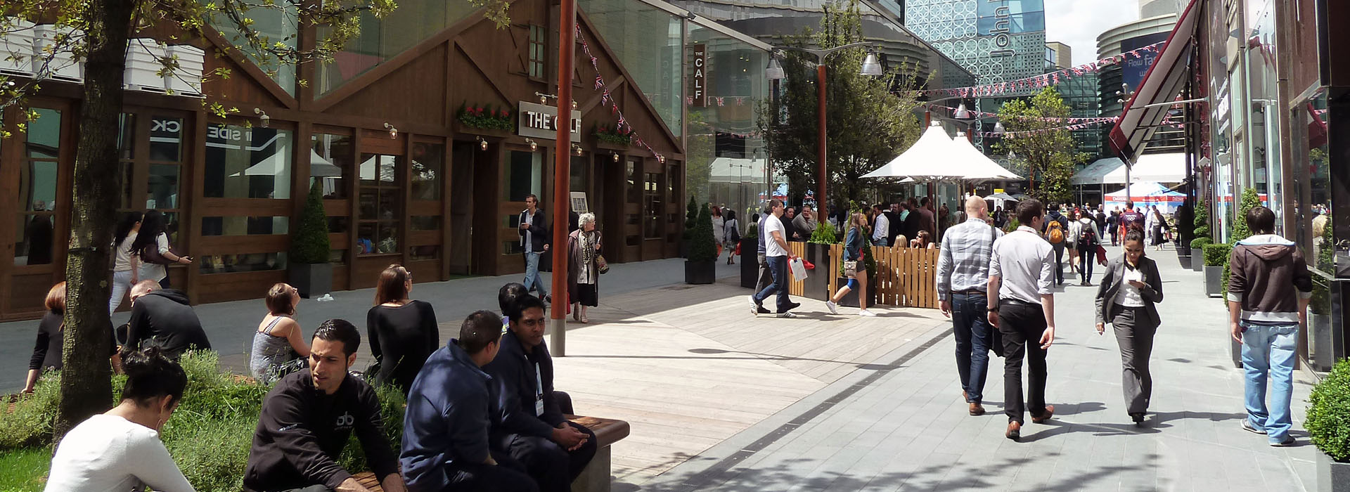 In order to achieve this, Townshend Landscape Architects proposed a series of improvements to the public spaces and connecting routes to the 'Streets' and to create intimate spaces to reducing the scale of the overall street. This included the incorporation of new lighting, external seating areas, an event structure, lawn and semi-mature trees to punctuate the linear spaces without losing key view to shop signs. A warmer palette of materials was introduced including timber and York Stone to encourage people to relax and enjoy the public spaces.