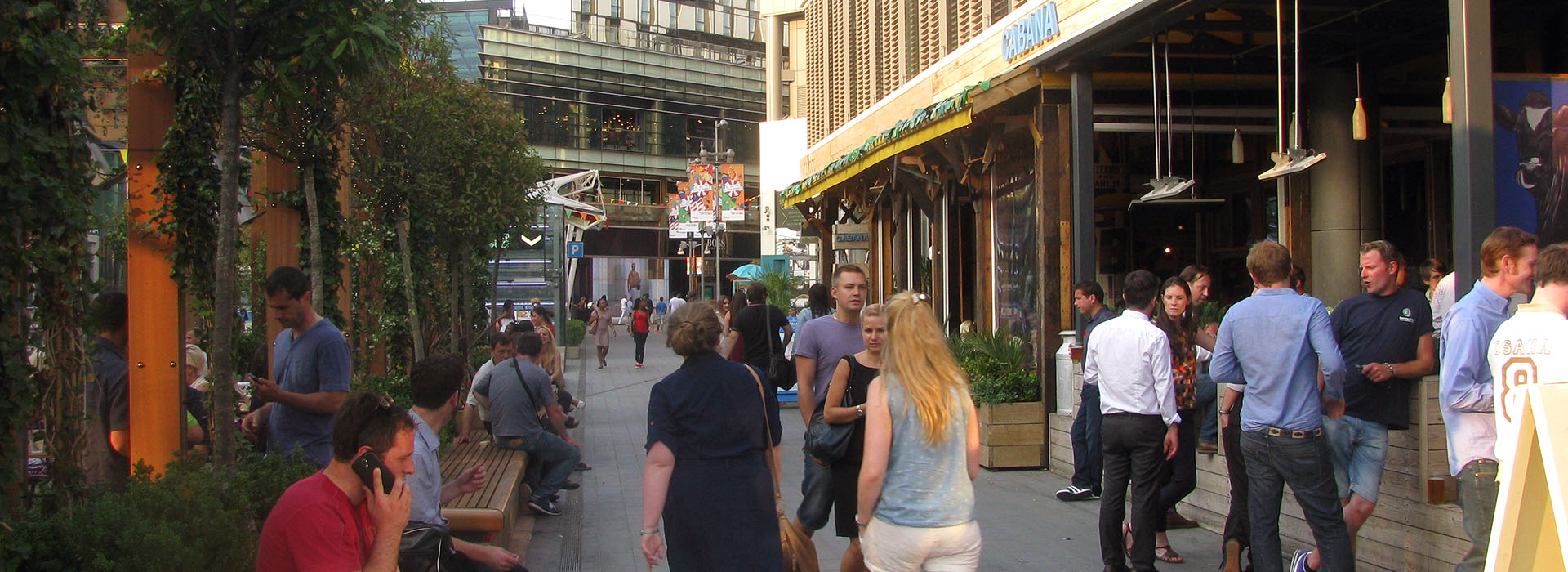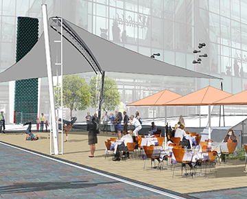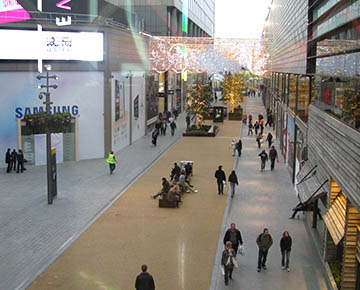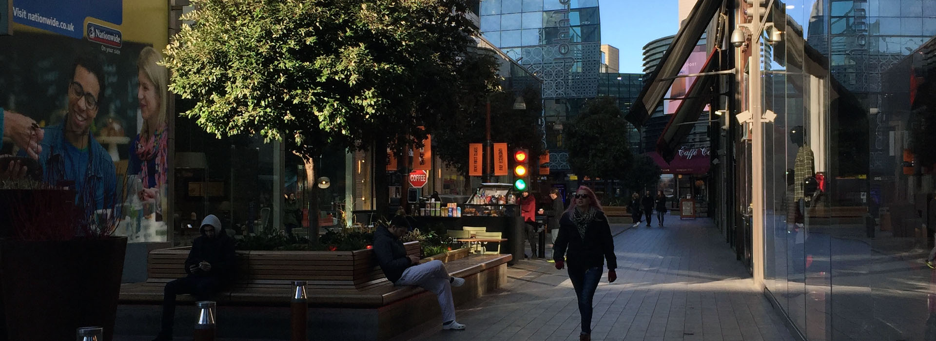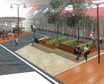 In order to achieve this, Townshend Landscape Architects proposed a series of improvements to the public spaces and connecting routes to the 'Streets' and to create intimate spaces to reducing the scale of the overall street. This included the incorporation of new lighting, external seating areas, an event structure, lawn and semi-mature trees to punctuate the linear spaces without losing key view to shop signs. A warmer palette of materials was introduced including timber and York Stone to encourage people to relax and enjoy the public spaces.